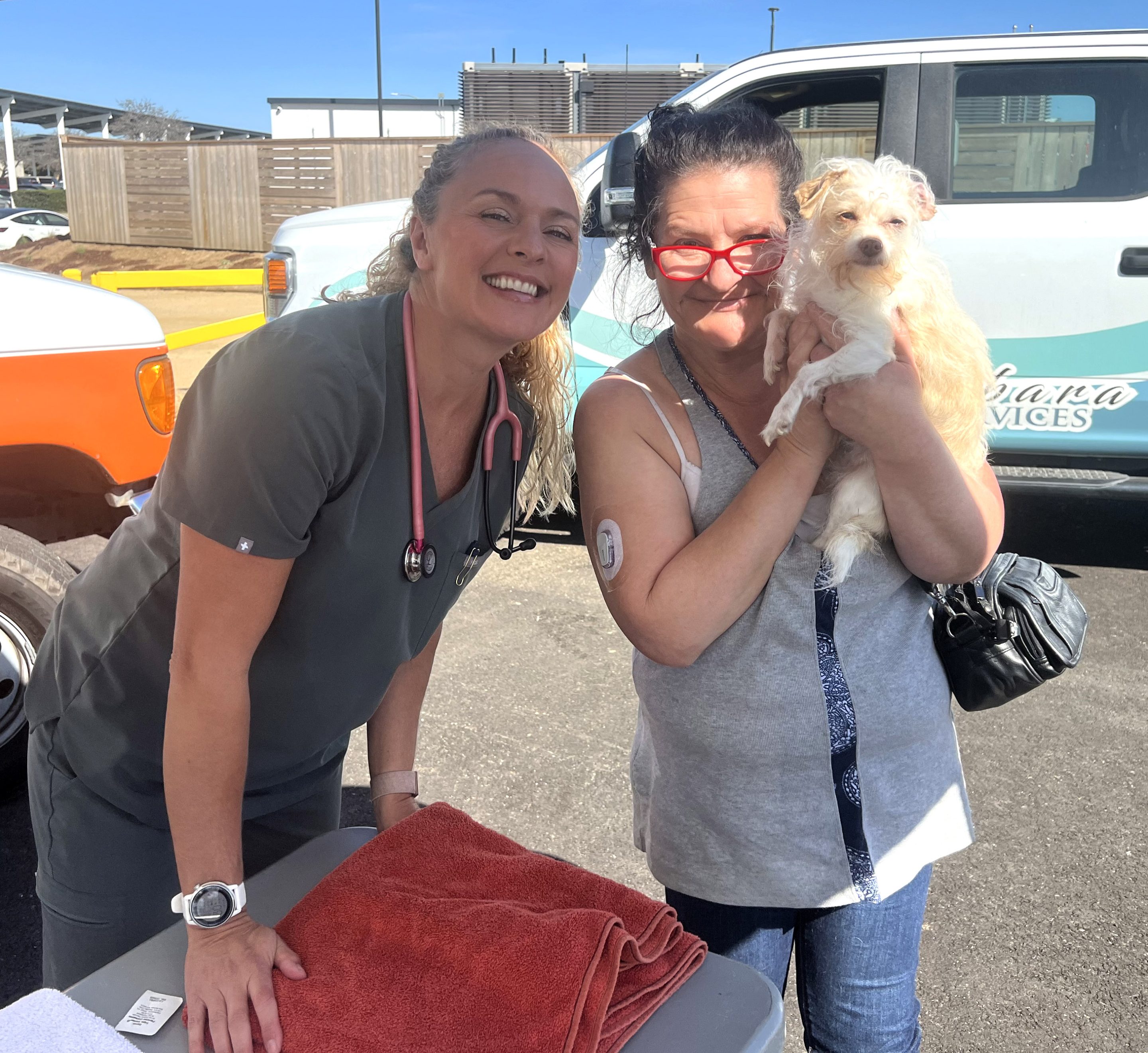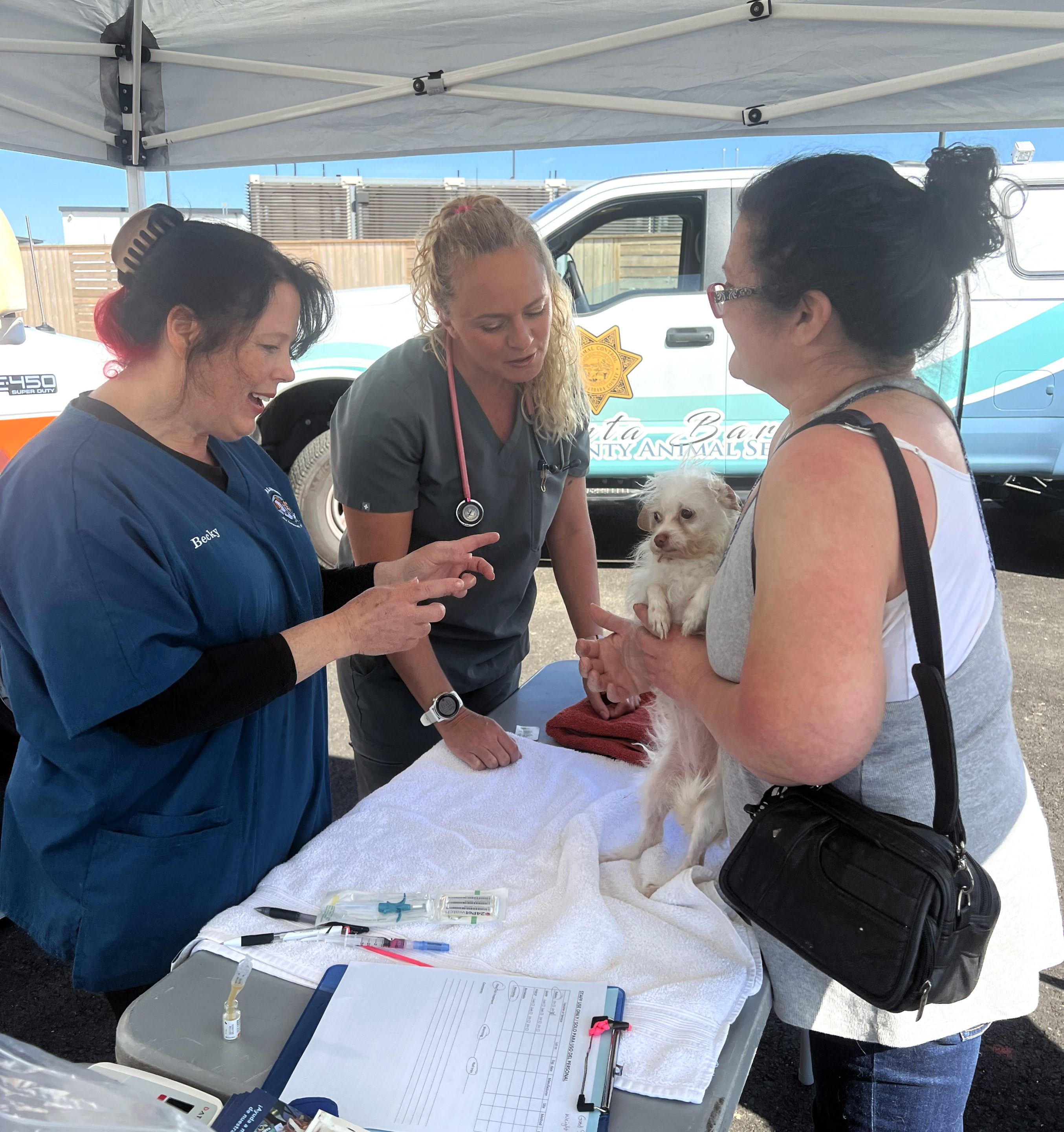 In the spring of 2024, C.A.R.E.4Paws partnered with Good Samaritan Shelter (“Good Sam”) to assist unsheltered pet families moved into two new, pet-friendly housing facilities by DignityMoves—Hope Village in Santa Maria and La Posada in Goleta—as well as Good Sam’s Lompoc shelter, Bridge House. Since March, we’ve hosted several wellness clinics at the shelter locations and surrounding areas. We also provide dog and staff training as well as assistance with food and supplies.